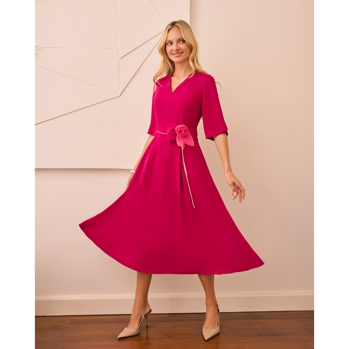 Elegancka sukienka w intensywnym amarantowym kolorze, o rozkloszowanym fasonie, który pięknie układa się w ruchu. Dekolt w kształcie litery V subtelnie wysmukla sylwetkę, a rękawy do łokcia zapewnia odpowiednie zakrycie ramion.