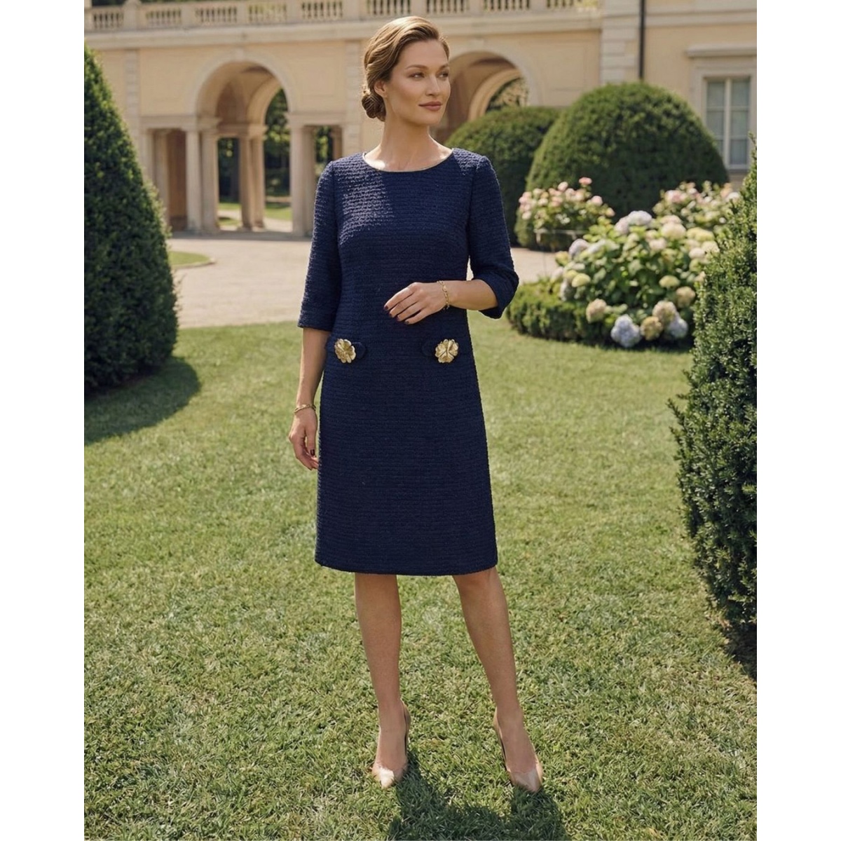 Elegancka sukienka w klasycznym, granatowym kolorze, wykonana z tkaniny typu bouclé, charakteryzującej się subtelną, strukturalną fakturą. Prosty, lekko dopasowany fason zapewnia komfort noszenia i ponadczasową elegancję.