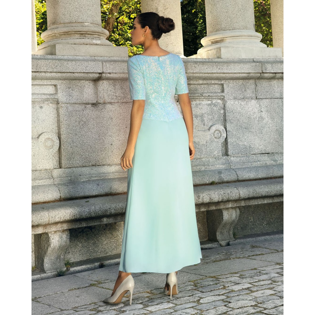 Najważniejsze cechy: ✔ Krój: elegancki, z prostą spódnicą i rozcięciem ✔ Góra: cekinowa, z ozdobnym wiązaniem w talii ✔ Rękaw: krótki ✔ Dekolt: klasyczny, okrągły ✔ Długość: maxi ✔ Kolor: miętowo-niebieski ✔ Podszewka: 100% wiskoza ✔ Zapięcie: zamek na plecach