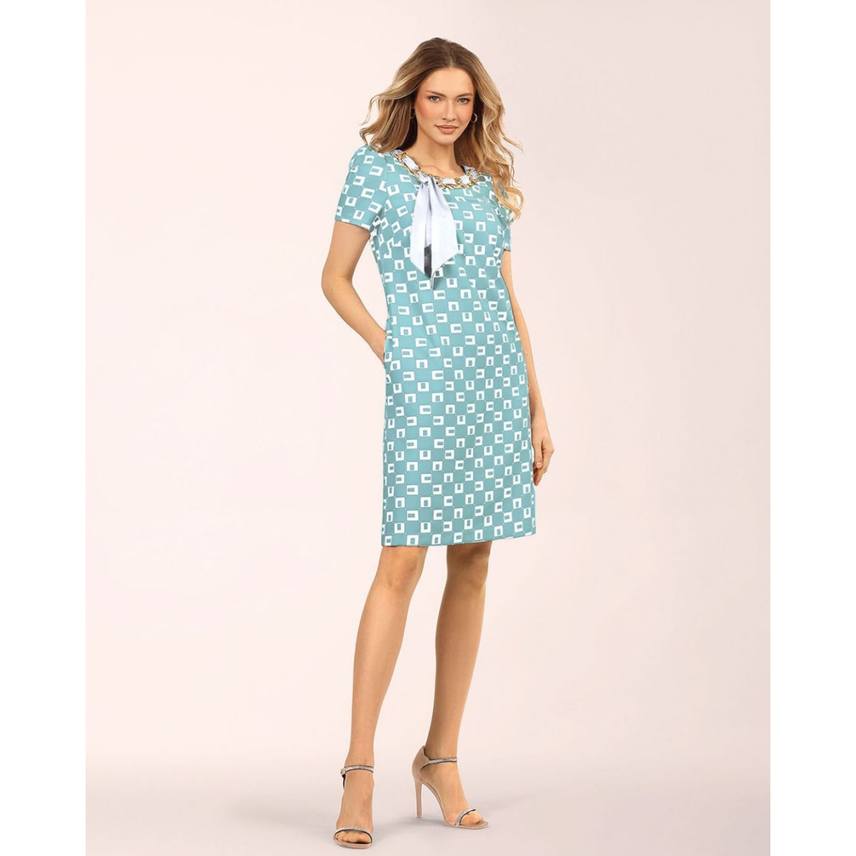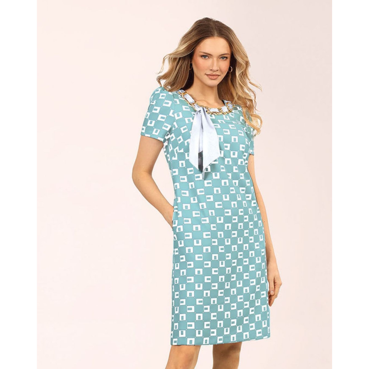 Sisi to stylowa sukienka wizytowa w pięknym odcieniu niebieskiego. Ma klasyczny prosty fason, który fantastycznie leży na różnych sylwetkach. Ozdobione subtelnymi bufkami rękawy są krótkie, idealne na ciepłą pogodę. Niewątpliwym atutem kreacji jest oryginalny geometryczny wzór na tkaninie. Okrągły dekolt jest ozdobiony złotym łańcuszkiem, przez który przewleczona jest apaszka, co nawiązuje do szykownego stylu old money vibe. Ta niezwykle atrakcyjna sukienka jest doskonała na lato i ciepłą wiosnę. Delikatna kolorystyka sprawdzi się przy wielu okazjach. Model wyposażony jest podszewkę z wiskozy. Na plecach jest kryty zamek. Kreacja ma kieszenie, co stanowi niezwykle praktyczny atut. Wiskozowa tkanina jest z niewielką domieszkę elastanu, dzięki czemu jest przewiewna i doskonale się układa na sylwetce.