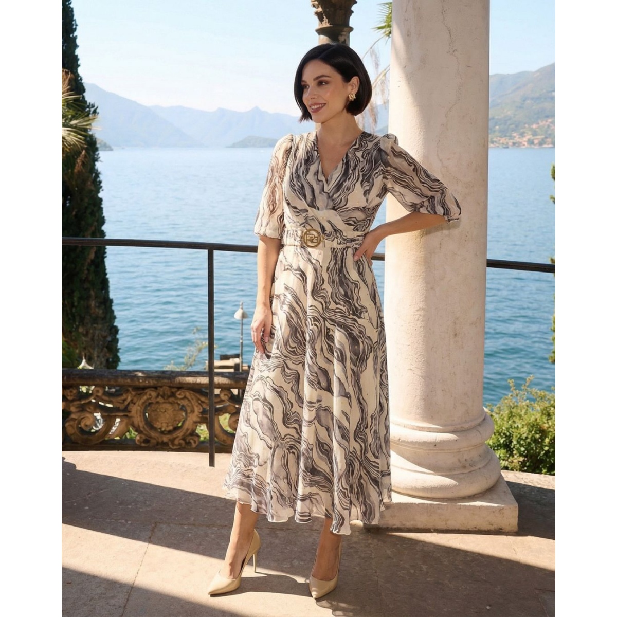 Ten model został zaprojektowany z myślą o paniach, które kochają zmysłową elegancję w subtelnym, wyrafinowanym stylu. Ta zwiewna sukienka damska z paskiem przykuwa wzrok! Zachwyca efektownym fasonem podkreślającym zalety kobiecej sylwetki, jak i stonowaną, elegancką kolorystyką, która łączy delikatny beż ecru z kontrastowym printem. Atrakcyjny wzór na tkaninie jest nieregularny, dzięki czemu kreacja ma niepowtarzalny charakter. Niezwykłego efektu sukience nadają błyszczące jety zdobiące materiał. Dzięki nim kreacja subtelnie mieni się w odbijającym świetle. Zwiewny dół modelu jest rozkloszowany, a talia podkreślona. Taki kobiecy fason doskonale komponuje się z kopertowym dekoltem. Krój świetnie leży na różnych typach sylwetek, wyrównując proporcje i pomagając zatuszować ewentualne niedoskonałości. Co ważne, taki fason, jak i linia dekoltu, efektownie akcentują atuty damskiej sylwetki. Elastyczny pasek z ozdobną klamrą w kolorze złotym nawiązuje do kolorystyki sukienki i dodatkowo podkreśla talię. Sukienka ma długość midi, która jest nie tylko szykowna, ale i bardzo uniwersalna - odpowiednia na wszelkiego typu eleganckie okazje. Wykończone mankietami rękawy ¾ mają swobodą formę i są delikatnie transparentne. Taki detal jest nie tylko modny, ale również dodaje kreacji lekkości i zmysłowości. Sukienka pięknie układa się w ruchu. Odpowiada za to nie tylko staranny krój i piękna tkanina, ale także pas tiulu, który jest wszyty w dole podszewki. Materiał jest bardzo efektowny pod względem estetycznym, ale także przyjemny w dotyku. Podszewka jest z wiskozy, dzięki czemu jest komfortowa i przyjazna dla skóry. Jest to element, który nie tylko zwiększa wygodę użytkowania sukienki, ale również wpływa pozytywnie na jej trwałość i nienaganny wygląd. Model zapinany jest na kryty zamek z boku, dzięki czemu zakładanie i zdejmowanie sukienki jest bardzo komfortowe.