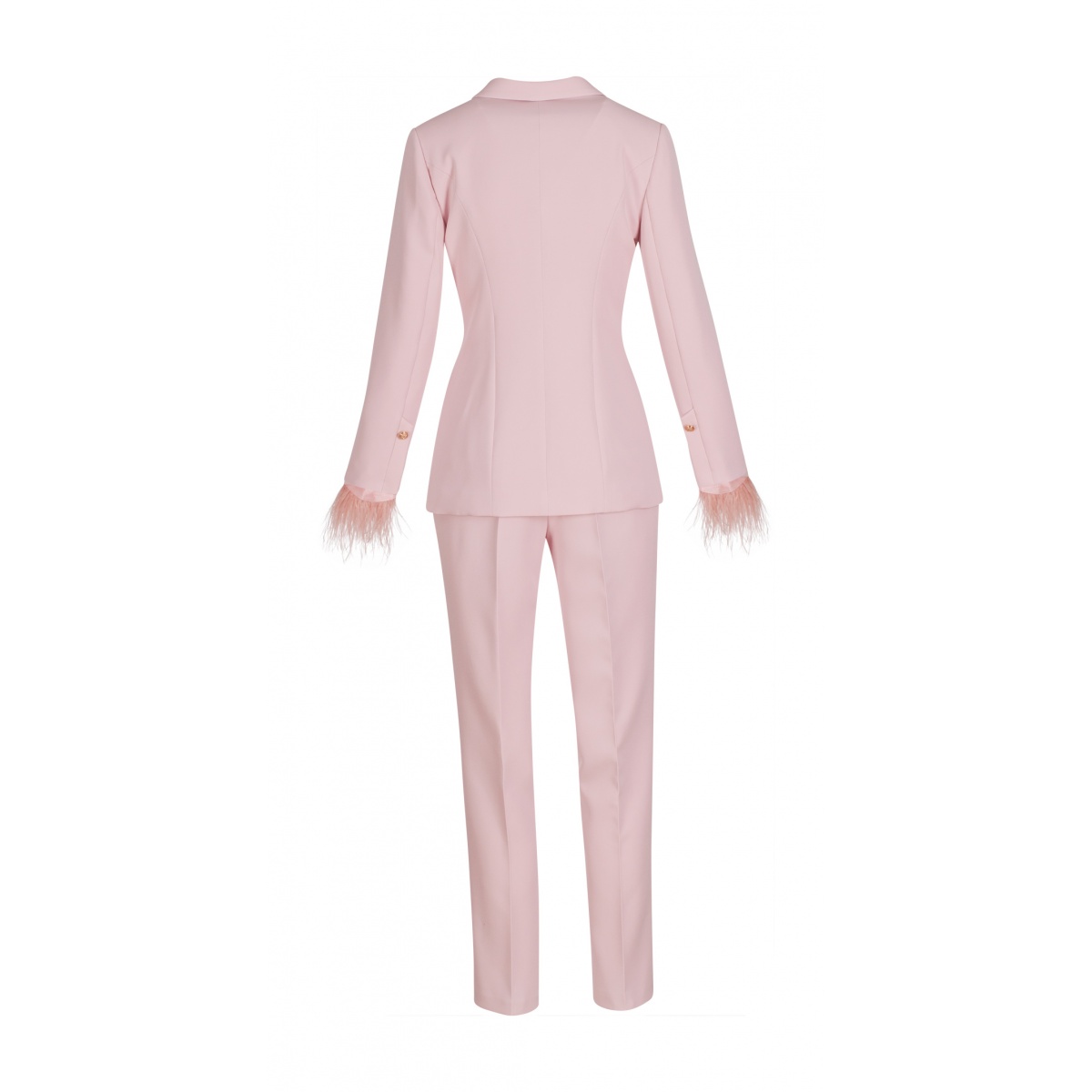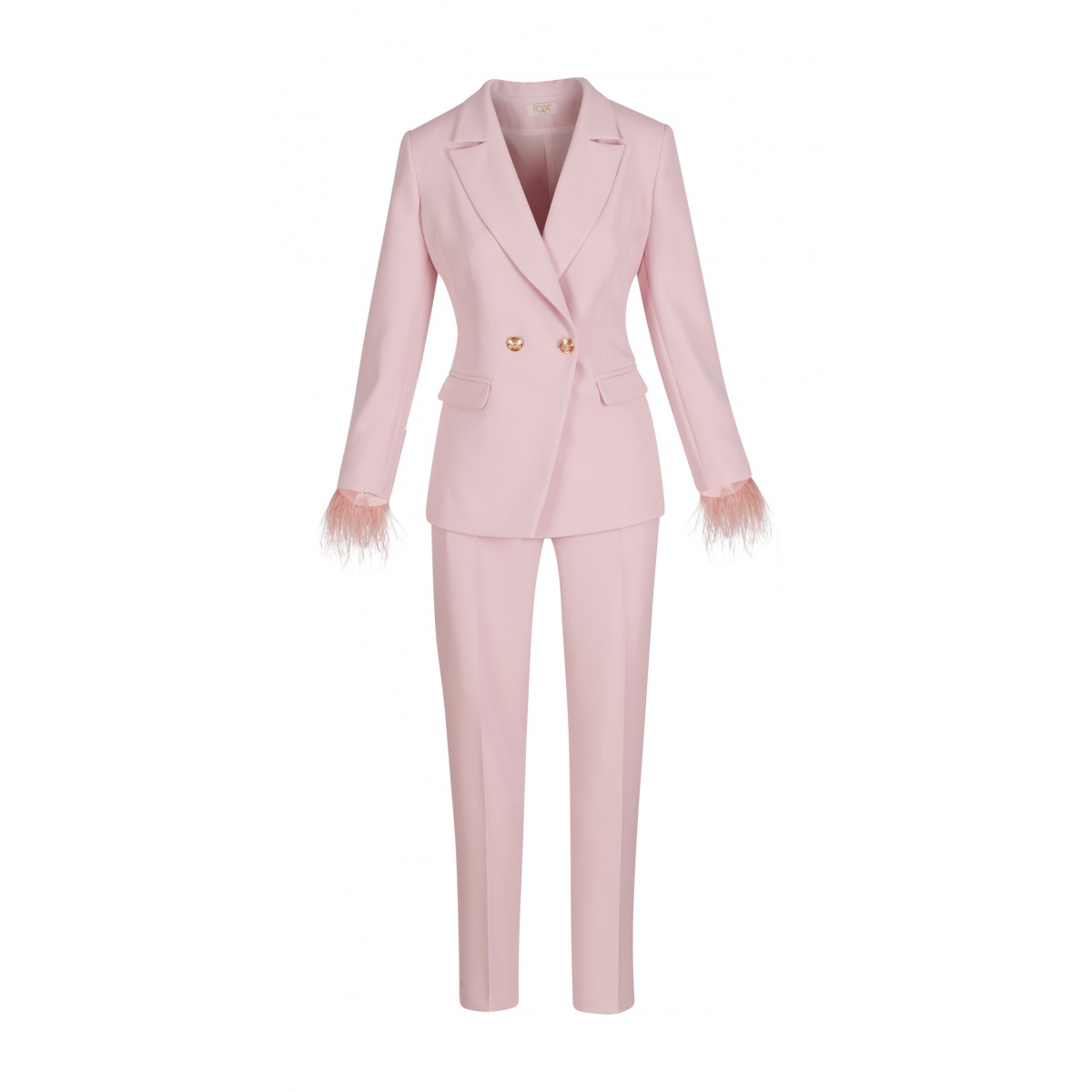 Set pentru doamne format din pantaloni eleganți tip țigară și o jachetă asortată. Setul a fost cusut din vâscoză rafinată de culoare roz deschis. Întregul set se află pe o căptușeală din vâscoză pentru un confort pe tot parcursul zilei. Materialul este moale și delicat, astfel încât nu limitează mișcarea și este foarte confortabil de purtat. Jacheta mulată foarte feminină are petice decorative. Jacheta se închide cu nasturi decorativi aurii. Cel mai mare avantaj al acestui sacou unic este reprezentat de penele decorative, care sunt detașabile, astfel încât puteți schimba complet caracterul setului, precum și să-l curățați în mod convenabil. Pantalonii de țigară sunt confecționați din material ușor și elastic, care asigură confort și libertate de mișcare. Acești pantaloni sunt concepuți să se termine la gleznă, ceea ce adaugă eleganță și subtilitate.