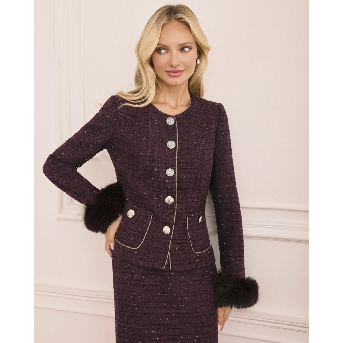 Costum clasic cusut din țesătură Chanel într-o frumoasă culoare burgundy. Jachetă mulată decorată cu nasturi aurii și fustă creion dreaptă. Ornament original din blană artificială pe manșete.