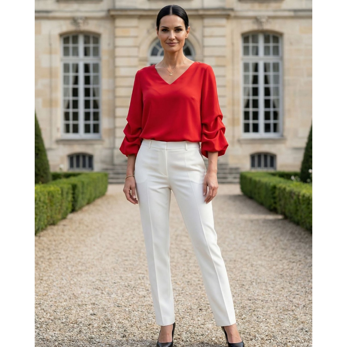 O bluză elegantă pentru femei, cu o croială atemporală, concepută pentru ocazii speciale. Decolteul subtil în V alungește frumos gâtul și subțiază silueta, menținând în același timp clasa și moderația.