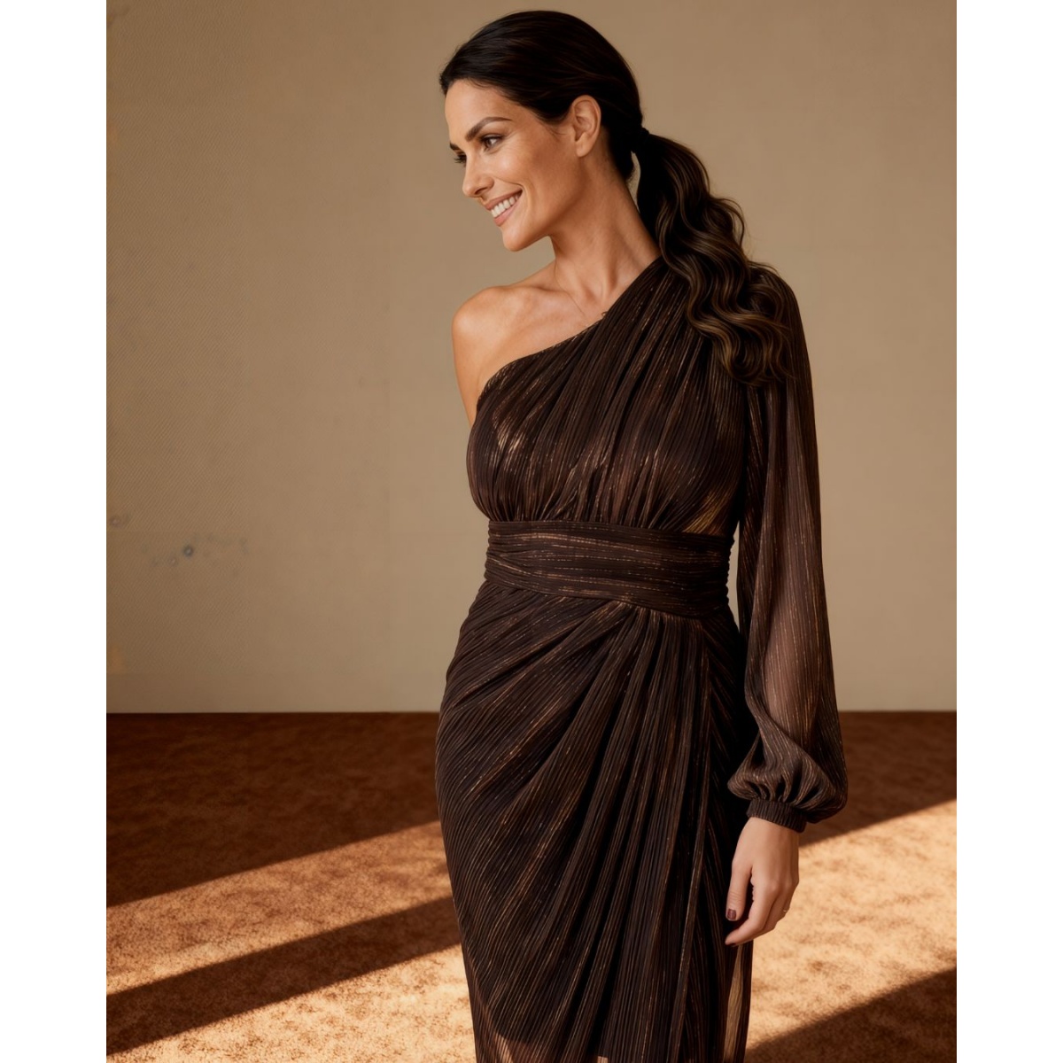 Rochie de seară cusută din șifon delicat și strălucitor. Pe dedesubt există o căptușeală opacă înainte de genunchi. Topul cu cupe rigidizate, ține ferm pe siluetă. Talia este subliniată cu o drapare izbitoare.