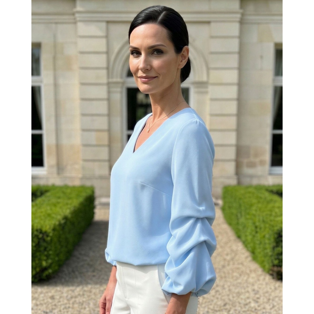 O bluză elegantă într-o culoare albastră moale, această bluză combină clasicul cu o formă modernă. Bluza are mâneci 3/4 izbitoare, cu o încrețitură delicată și elastic la manșetă.
