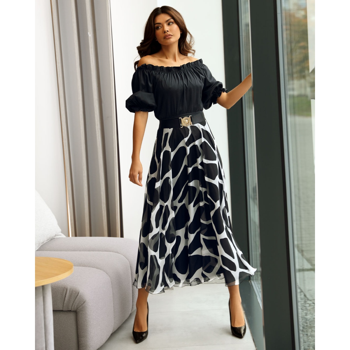 Rochie în stil spaniol cu decolteu carmen, lungime midi. Talia decupată, a fost accentuată și mai mult cu o curea elegantă cu cataramă aurie. Partea de jos din sifon cu un model geometric conferă rochiei lejeritate și aerisire.