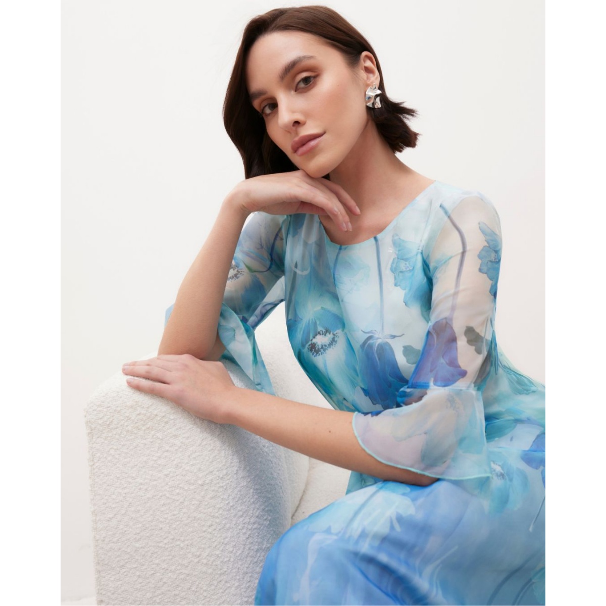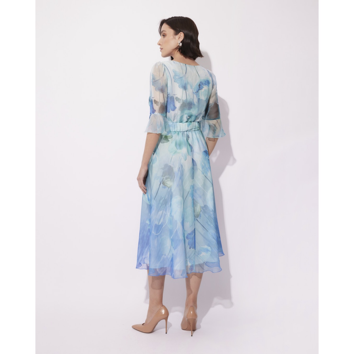O rochie delicată, aerisită, realizată din mătase sintetică ușoară în nuanțe de albastru, decorată cu un model floral subtil. Este o alegere ideală pentru ocazii speciale, adăugând lejeritate și farmec feminin stilului.