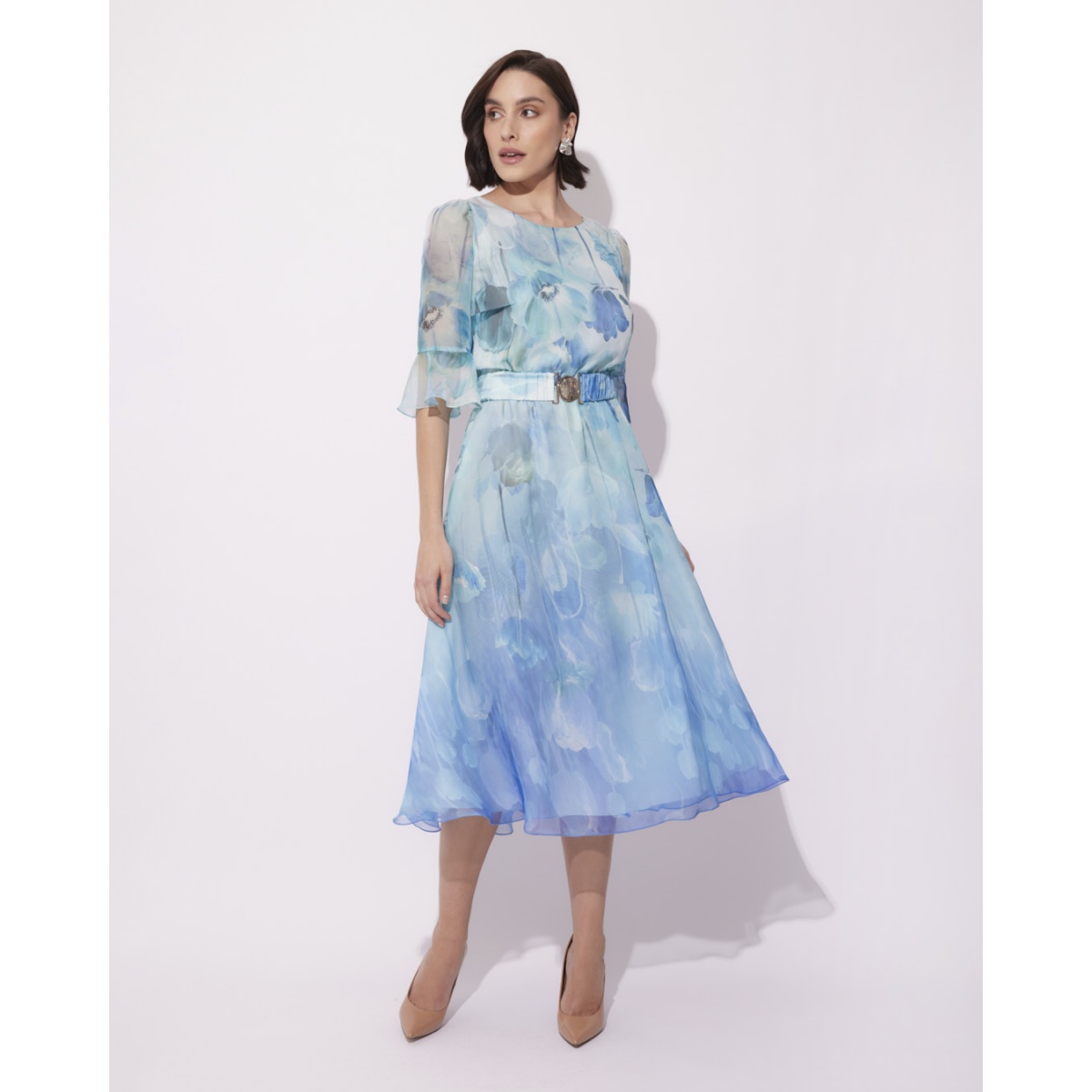 ✔ Material: mătase sintetică - ușoară, aerisită, rezistentă la încrețire ✔ Model: flori subtile în nuanțe de albastru ✔ Decolteu: clasic, rotund ✔ Mâneci: până la cot, finisate cu un volan ✔ Talie: decupată, cu elastic pentru confort, accentuată suplimentar cu o curea elegantă cu cataramă aurie ✔ Fund: evazat, lungime midi ✔ Închidere: buton la spate