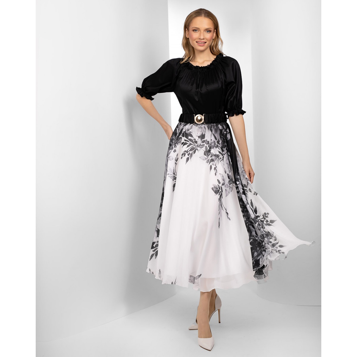 Acest model este o propunere elegantă pentru doamnele care iubesc chic-ul cu o notă de romantism. Această rochie midi florală neagră extrem de feminină a fost concepută pentru a expune senzual punctele forte ale siluetei unei femei într-un stil sofisticat. Tivul evazat din șifon de lungime midi conferă creației o lejeritate, ajutând în același timp la uniformizarea proporțiilor siluetei. Talia este subliniată de o curea elastică cu o cataramă decorativă. Partea de sus a creației este cusută din tafta neagră delicată. Are un decolteu spaniol, care poate fi purtat și pentru a acoperi umerii, și mâneci ușor șlefuite până la cot. Ceea ce atrage atenția este combinația izbitoare de culori. Tivul vaporos este alb, decorat cu un imprimeu floral negru subtil care subliniază natura romantică a creației. Sub stratul de șifon există o căptușeală, care influențează aspectul, confortul de utilizare, dar și durabilitatea creației. Croiala acestei rochii izbitoare este perfectă pentru orice tip de siluetă.