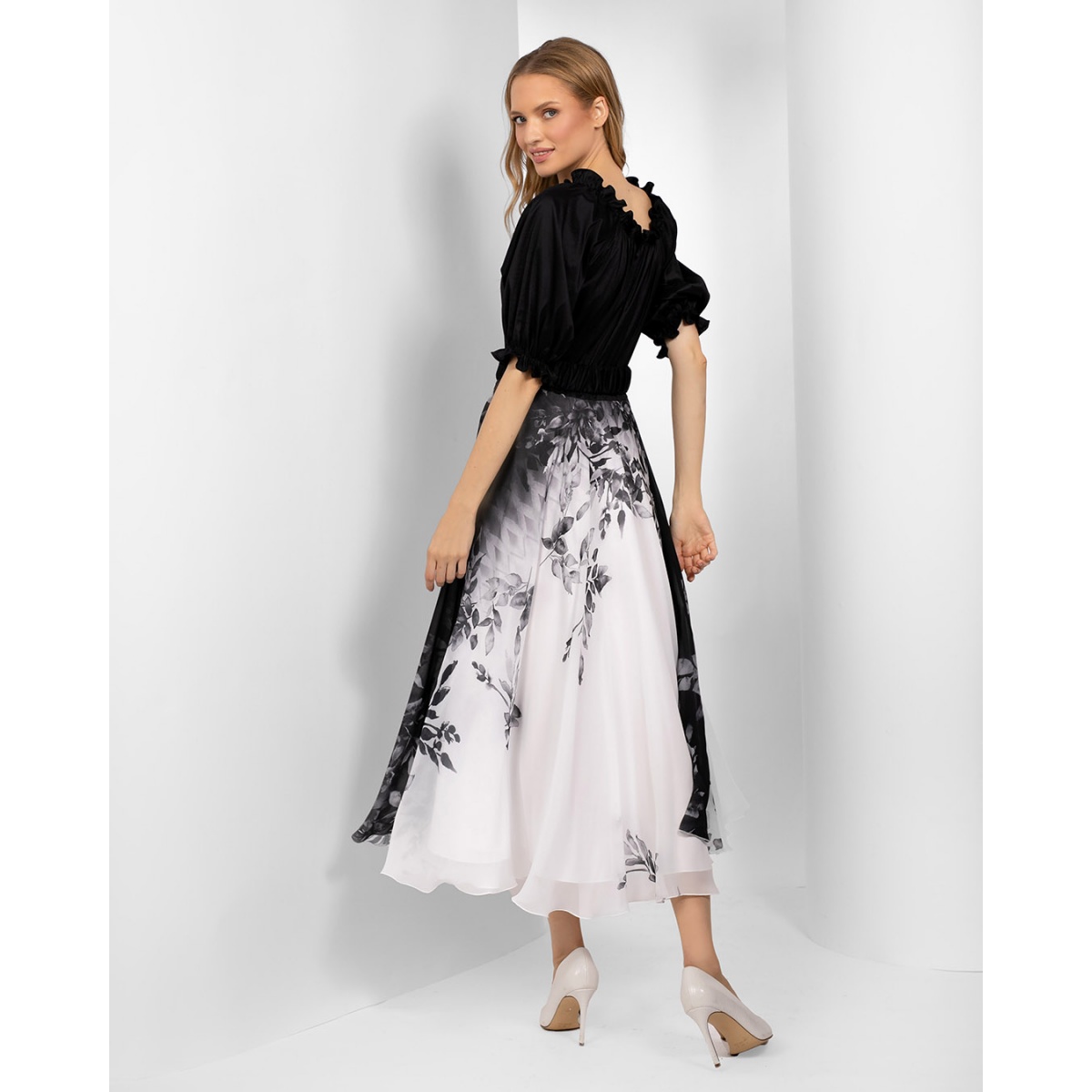 Rochie de seară elegantă, aerisită, de lungime midi. Partea de sus neagră cusută din tafta delicată și partea de jos din șifon aerisit cu model floral negru.