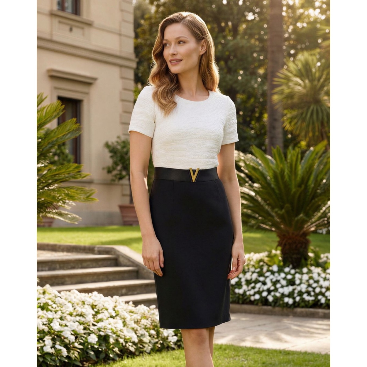 O rochie până la genunchi, realizată din țesături combinate, cu talie accentuată de o curea elegantă cu cataramă. Combinația de culori alb și negru face ca această rochie să fie ideală atât pentru vară, cât și pentru toamnă, fiind alegerea perfectă atât pentru ieșirile casual, cât și pentru cele elegante.