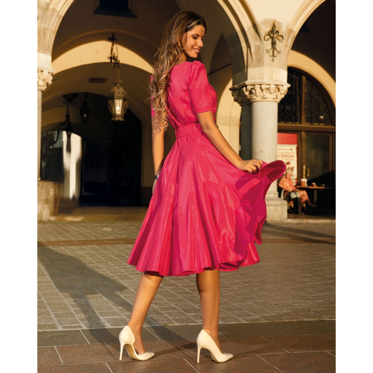 O rochie frumoasă cu partea de sus ajustată și partea de jos evazată, cu tăieturi izbitoare care o fac să curgă frumos. Talia este subliniată suplimentar cu o curea decorativă.