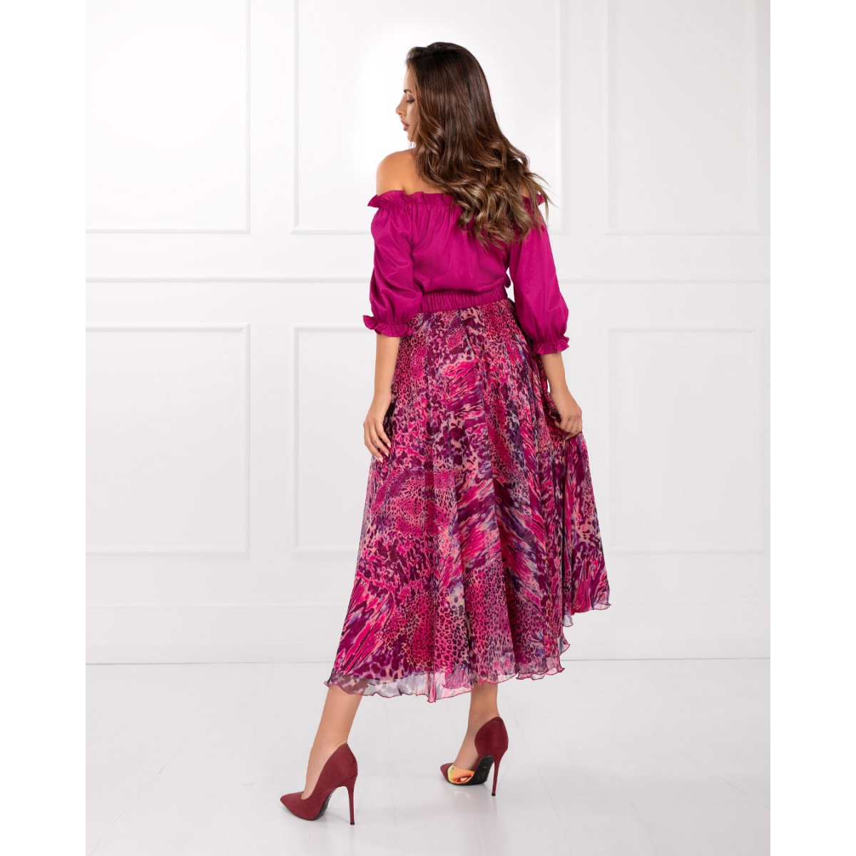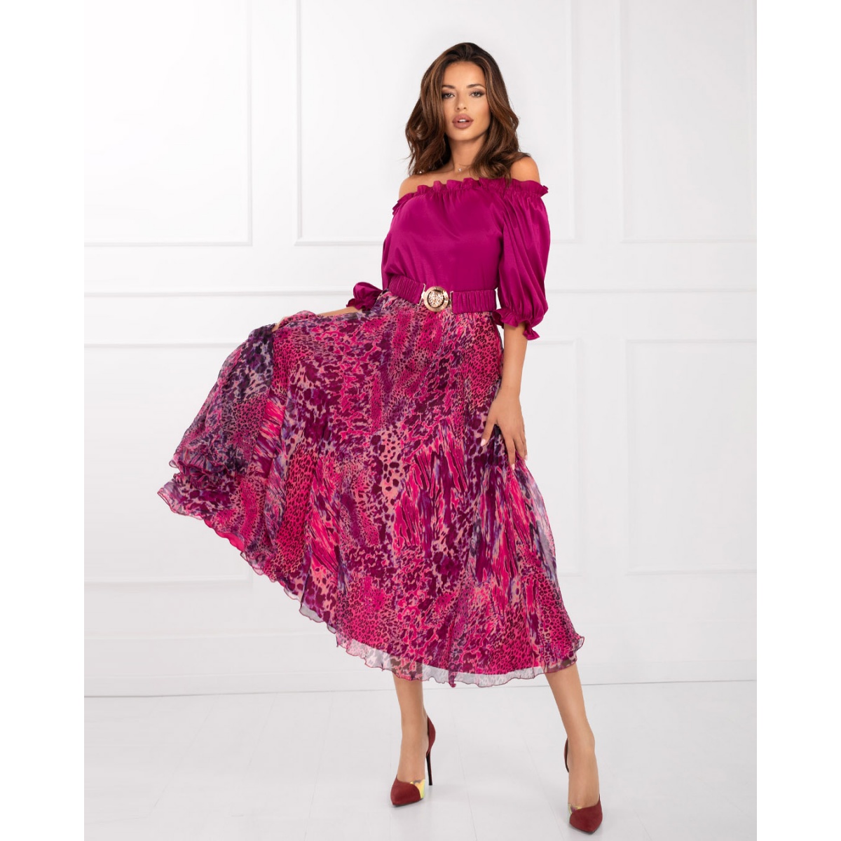 Această rochie fenomenală în stil spaniol într-o culoare fucsia energică este baza perfectă pentru un look care iese din mulțime. Decolteul voluptuos și tivul aerisit al rochiei fac din aceasta o creație extrem de feminină, care îți va evidenția sex-appeal-ul într-un stil elegant. Partea superioară a modelului impresionează prin culoarea saturată și luciul mătăsos delicat. Partea de jos a rochiei este realizată din șifon aerisit cu un imprimeu pitoresc modern în nuanțe perfect asortate. Croiala funcționează bine pe diferite tipuri de corp. Ajută la echilibrarea proporțiilor, la evidențierea atuurilor siluetei și la accentuarea taliei. Călcâiul vaporos și evazat adaugă lejeritate stilului și, de asemenea, ajută la ascunderea oricăror imperfecțiuni din această parte a siluetei. Decolteul spaniol este esența feminității. Decolteul spaniol poate fi purtat deschis la nivelul umerilor sau mai ascuns. Decolteul este decorat cu o încrețitură izbitoare. Talia este subliniată în continuare de o curea elastică elegantă cu o cataramă decorativă. Rochia în stil spaniol are și avantajul unei lungimi midi, care este atemporală și potrivită pentru multe ocazii. Mânecile la modă, delicat bufante, lungi până la cot, atrag de asemenea atenția. Creația este prevăzută cu o căptușeală din vâscoză.