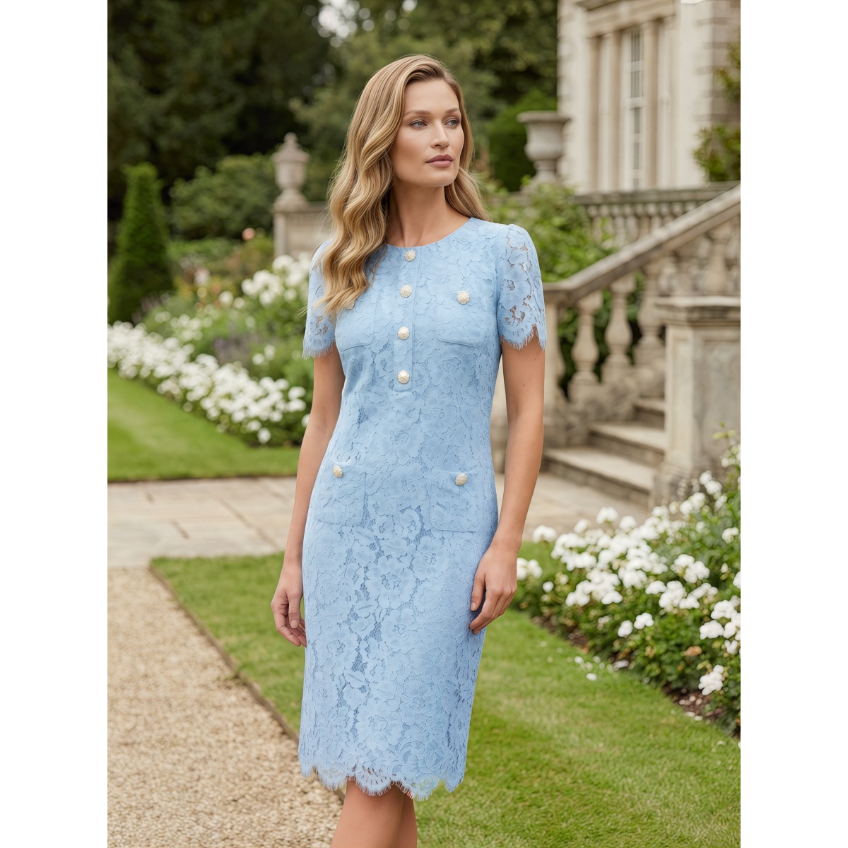 Rochie elegantă într-o culoare delicată de albastru, realizată din dantelă spectaculoasă cu un model subtil de flori. Forma clasică, potrivită, subliniază frumos silueta.