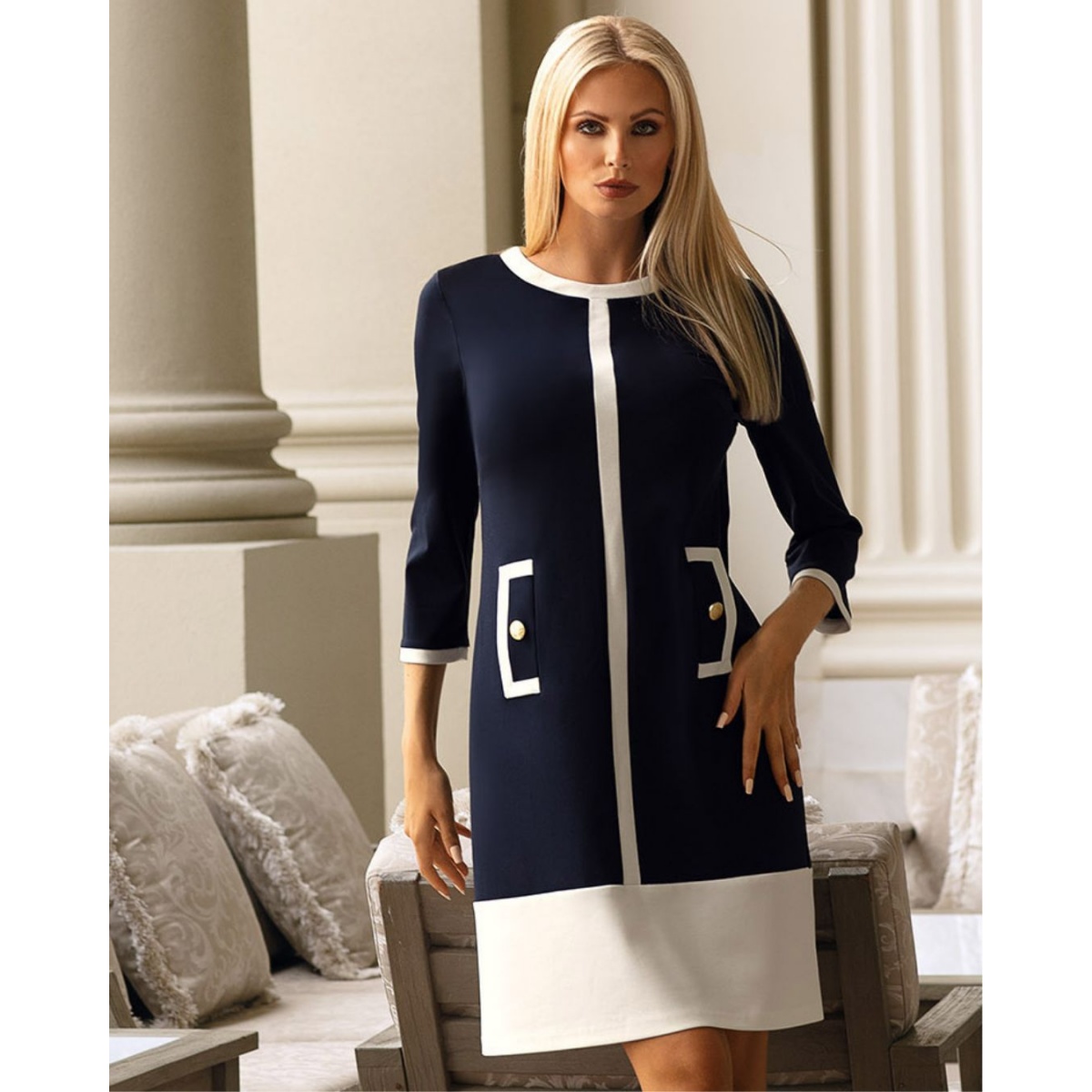Rochia formală albastru marin cu bordură contrastantă este o propunere atemporală pentru femeile care apreciază clasicul și confortul. Croiala simplă și elegantă subliniază silueta, în timp ce materialul elastic, foarte confortabil, asigură o purtare confortabilă pe tot parcursul zilei.
