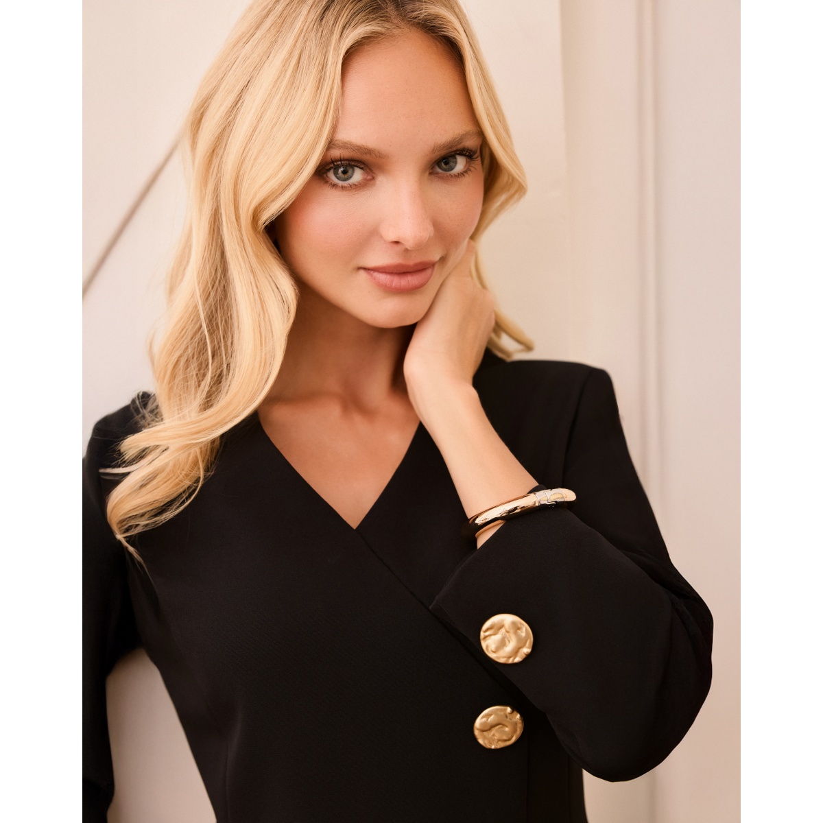 ✔ Croială ajustată cu tăieturi verticale și asimetrice pentru o siluetă mai subțire ✔ O abordare elegantă a croielii navy - linii structurale și decolteu în V inspirate de rochiile sacou ✔ Țesătură neagră mată, moale și plăcută - conținut ridicat de vâscoză, se potrivește frumos siluetei ✔ Mâneci drepte 7/8, finisată cu un nasture auriu decorativ ✔ Lungime până la genunchi - perfectă pentru întâlniri, sărbători și ieșiri elegante ✔ Căptușeală din viscoză pentru confort pe tot parcursul zilei ✔ Fermoar ascuns la spate - discret și practic ✔ Patru nasturi aurii pe față, plasați de-a lungul tăieturii oblice - un detaliu izbitor care adaugă caracter rochiei