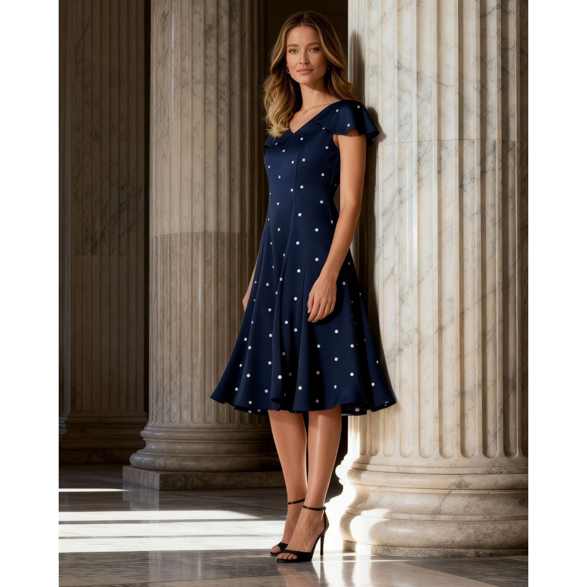 ✔ Model: albastru marin cu mici buline albe ✔ Croială: partea de sus ajustată, partea de jos evazată ✔ Decolteu: decolteu feminin în V ✔ Mâneci: scurte, sub formă de volane delicate ✔ Lungime: midi ✔ Căptușeală: viscoză pentru confort ✔ Închidere: fermoar la spate