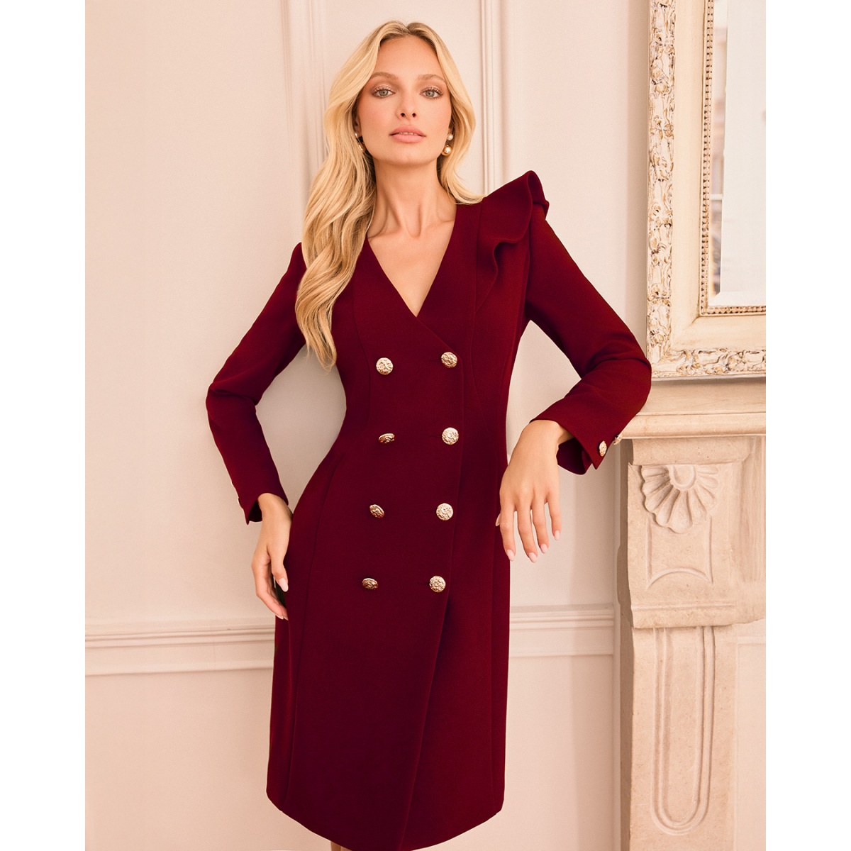 Это бордовое формальное платье впечатляет современной интерпретацией классического покроя цвета морской волны. Двубортный крой, элегантные золотые пуговицы и тонкая оборка на плечах создают образ, полный класса, женственности и изысканности.
