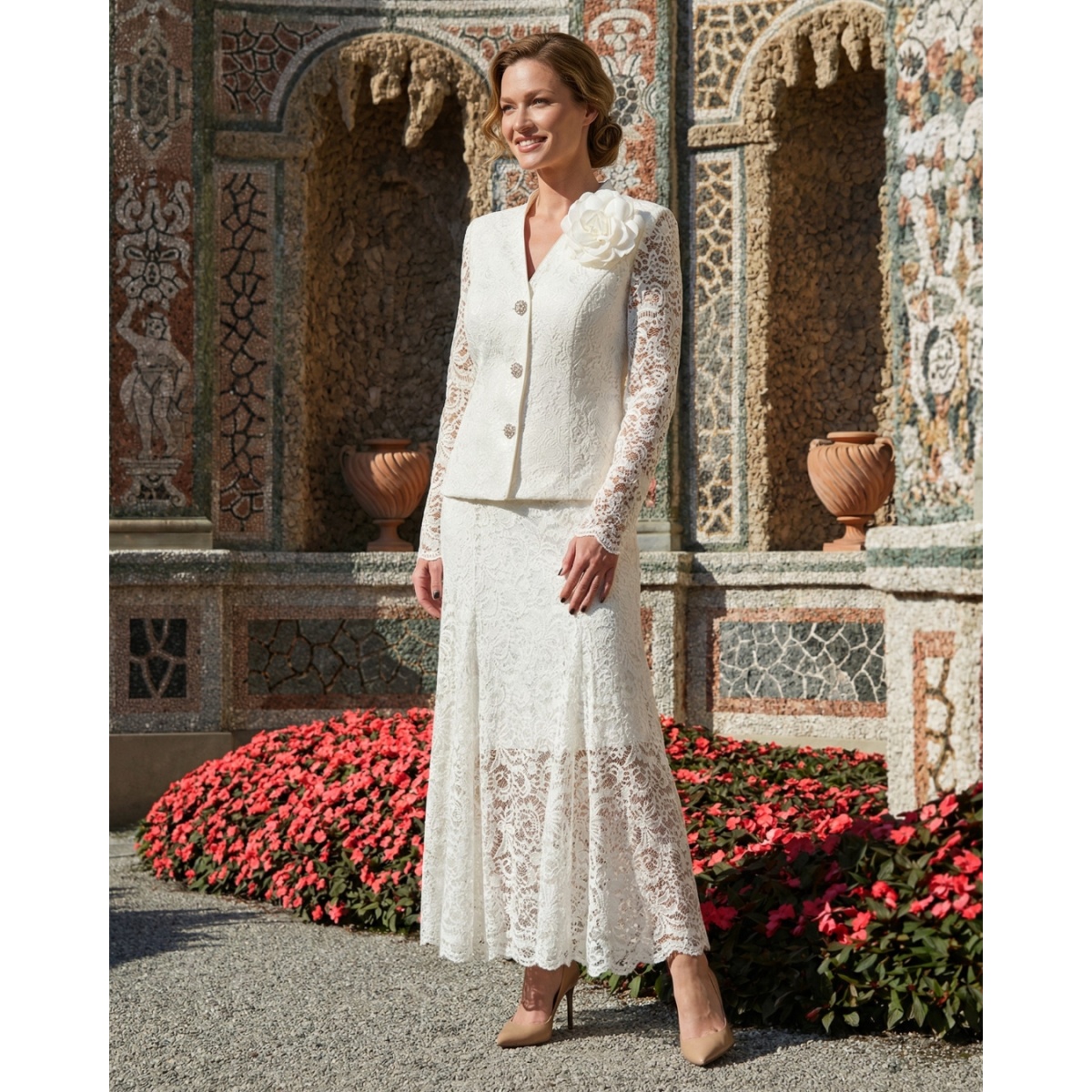 Уникальный комплект из кружева в элегантном белом цвете - это предложение для семейных торжеств, свадеб, коммуний или других особых случаев.