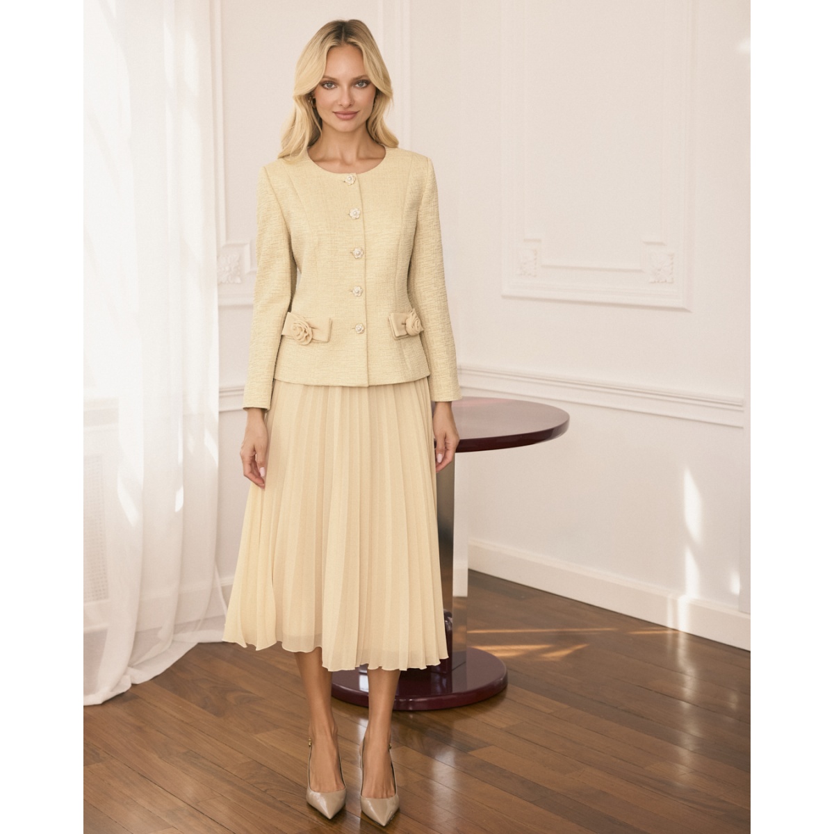Элегантный костюм золотого цвета. Приталенный жакет с декоративными пуговицами красиво подчеркивает силуэт, а легкая плиссированная юбка обеспечивает свободу движений.
