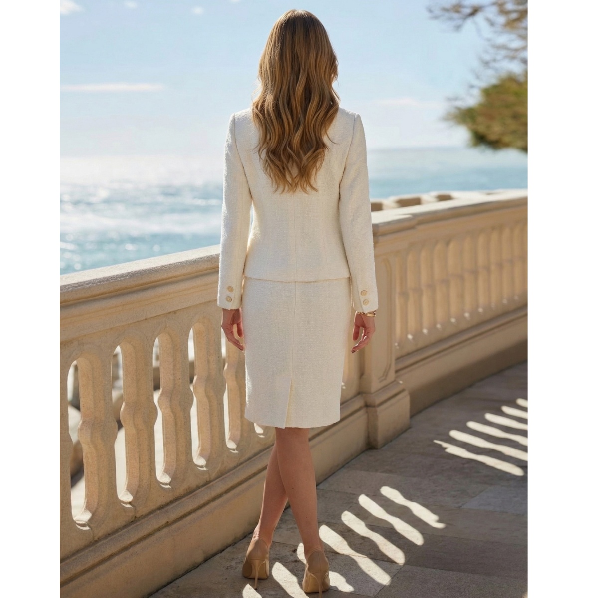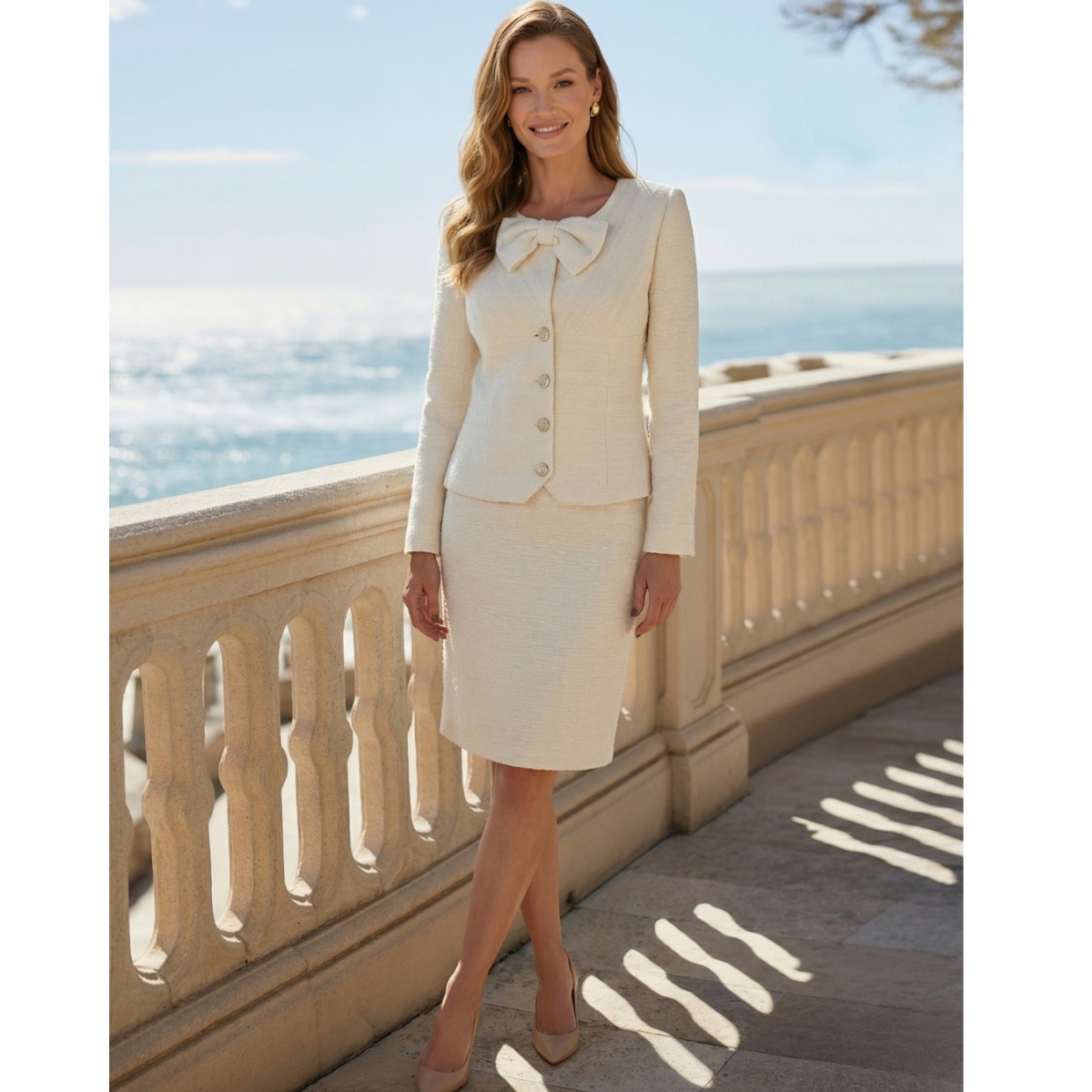 Этот комплект - отличный выбор для женщин, которые ищут шикарный и вечный образ, сочетающий классическую элегантность с женственной нежностью.