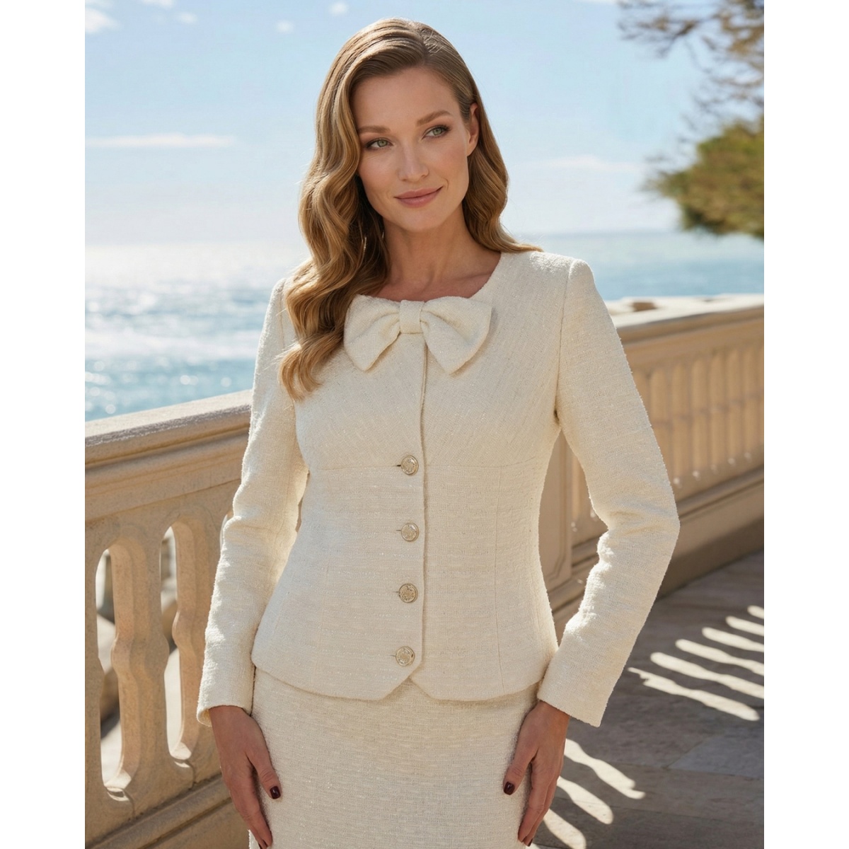 Жакет выполнен из элегантной ткани типа букле, вдохновленной классическим стилем дома моды Chanel. Структурная текстура материала придает общему виду уникальный характер и подчеркивает высокое качество исполнения. Модель имеет круглый вырез, украшенный эффектным бантом, который добавляет образу женственного очарования. Фронт жакета украшают элегантные золотые и белые пуговицы, которые подчеркивают его классический характер. Облегающий крой красиво моделирует фигуру и подчеркивает талию.
