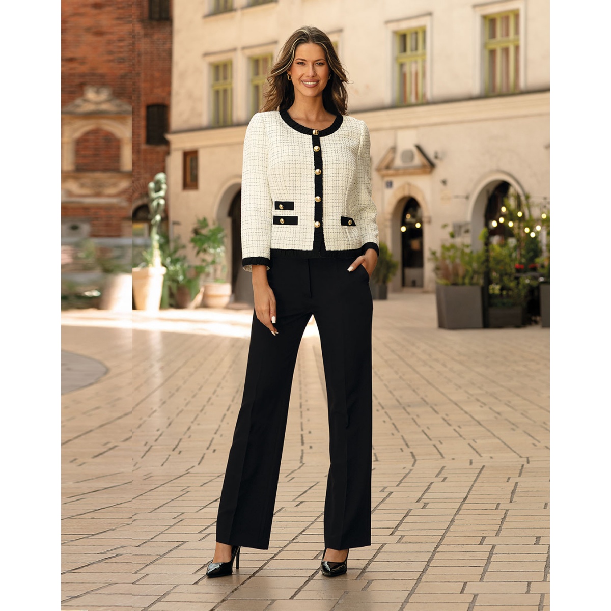 Элегантный женский комплект из жакета, сшитого из ткани типа "шанель", украшенного золотыми пуговицами и черной отделкой, и простых элегантных брюк.