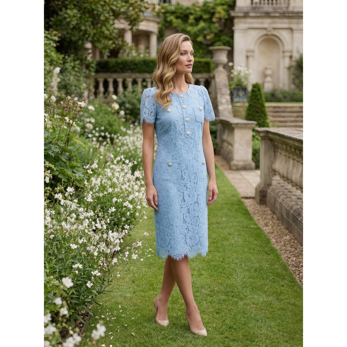 Элегантное платье в нежном голубом цвете, выполненное из эффектного кружева с изящным цветочным узором. Классический, облегающий фасон прекрасно подчеркивает фигуру.