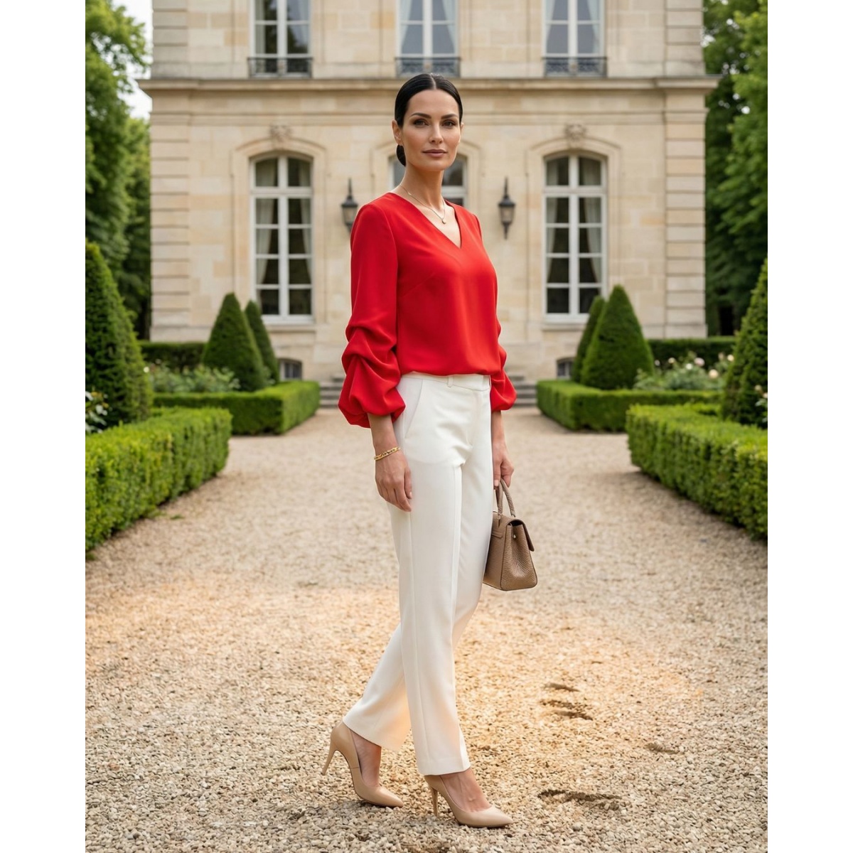 Элегантная женская блузка вневременного кроя, созданная для особых случаев. Утонченный V-образный вырез красиво удлиняет шею и стройнит силуэт, сохраняя при этом класс и сдержанность.