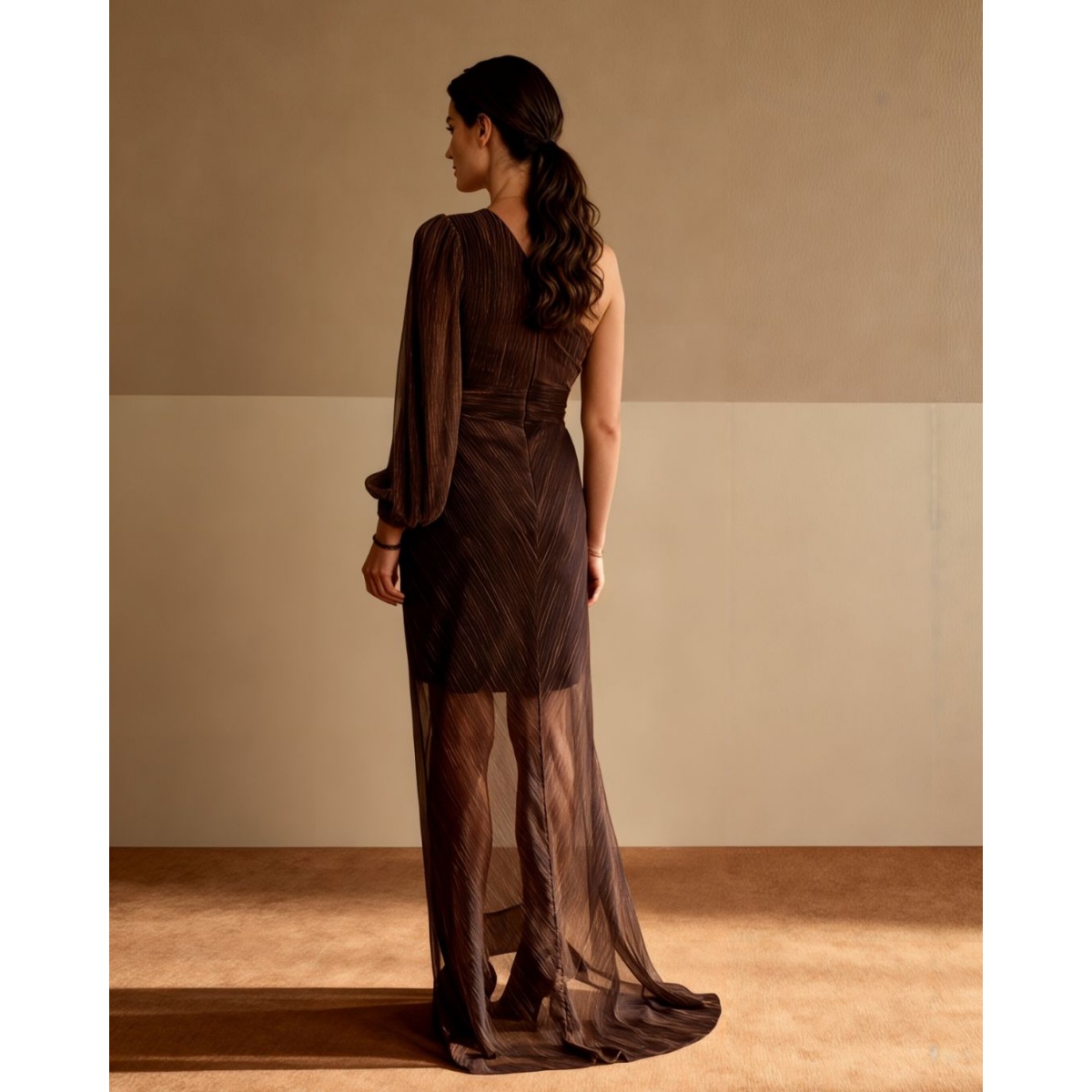 Вечернее платье сшито из нежного мерцающего шифона. Под ним находится непрозрачная подкладка до колена. Верх с жесткими чашечками устойчиво держится на силуэте. Талия подчеркнута эффектной драпировкой.