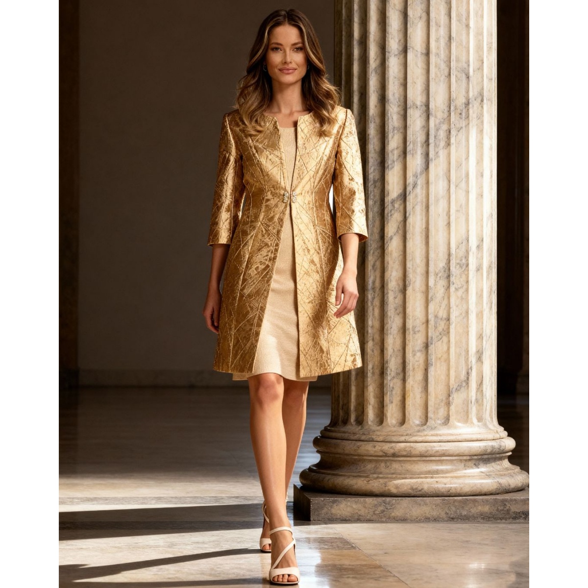 Мы часто сталкиваемся с проблемой, что подобрать к элегантному платью, чтобы оно оставалось шикарным и в более холодные дни, и во время зимних торжеств, когда в помещении гораздо холоднее. Деловое пальто Bergamo сшито из высококачественного жаккарда золотистого цвета. Идеально скроенное, оно очень красиво подчеркивает фигуру.