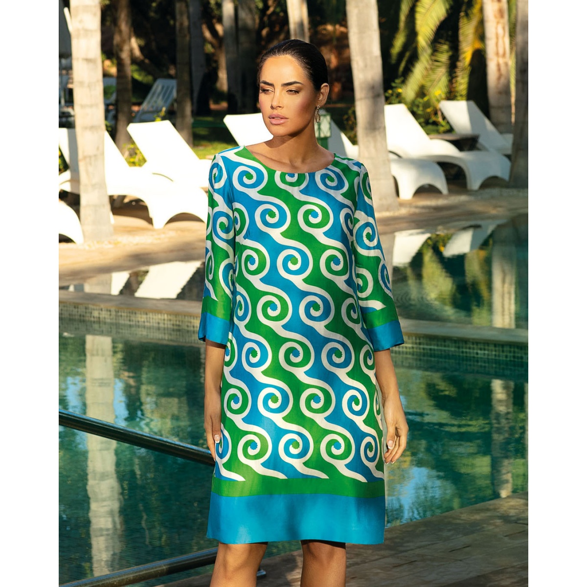 Свободное платье-трапеция в красивых летних цветах. Классический крой длиной до колена и широкие рукава 3/4 делают эту модель идеальным выбором как для повседневной жизни, так и для выхода в свет.