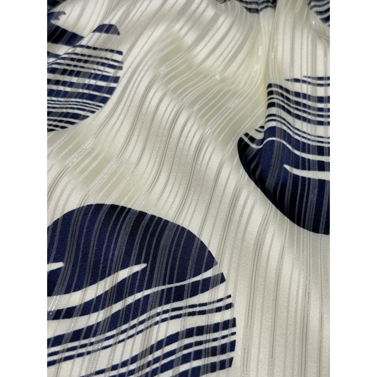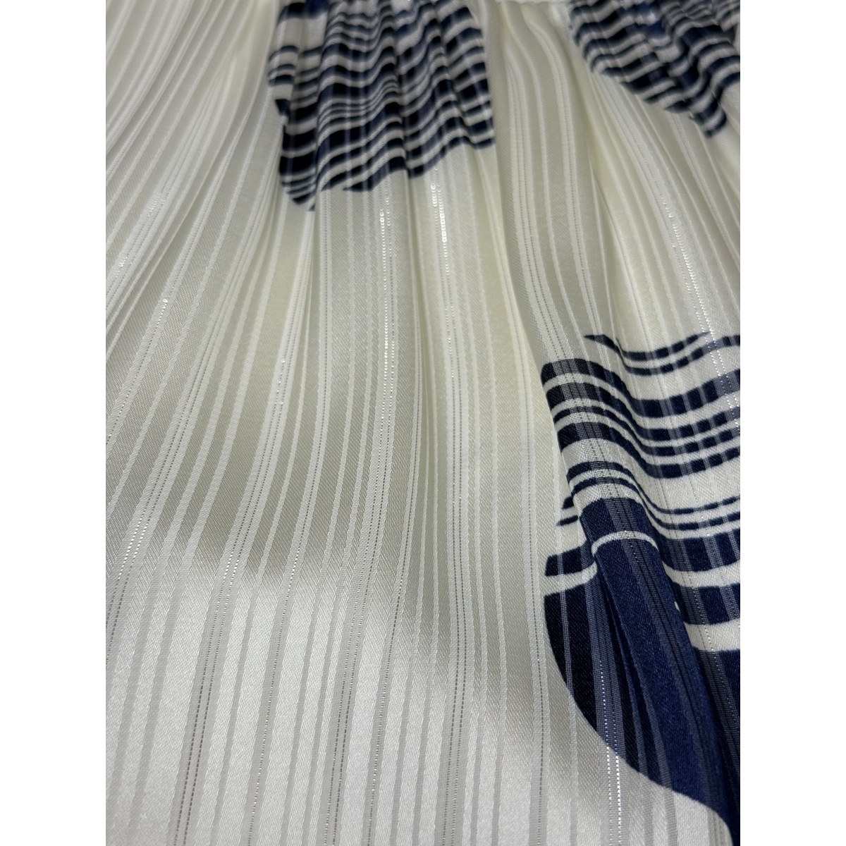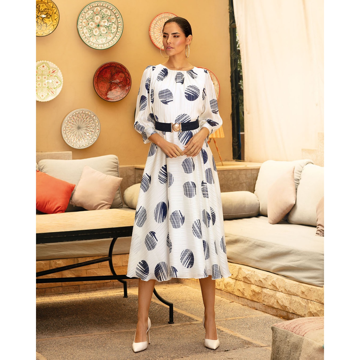Воздушное платье длины миди, сшитое из воздушной ткани с темно-синими кругами. Талия подчеркнута эластичным поясом.