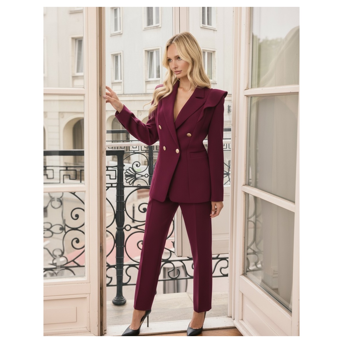 Элегантный женский костюм бордового цвета, сочетающий в себе классику и современные линии. Идеально скроенный пиджак и прямые брюки, удлиняющие ноги.