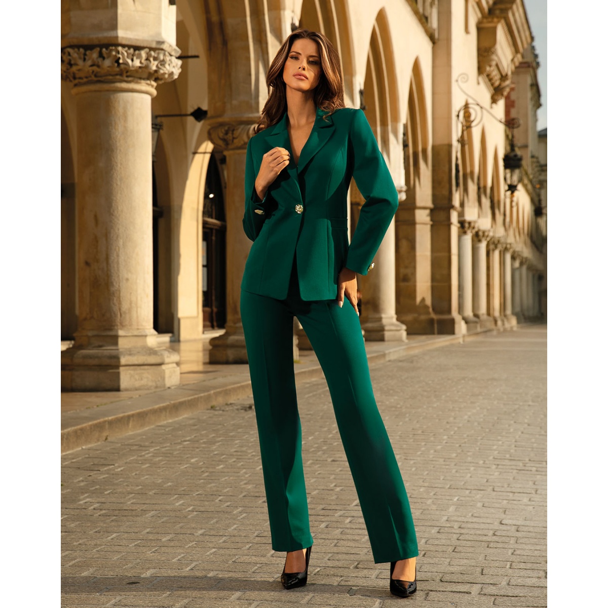 Элегантный комплект из двух частей глубокого зеленого цвета. Приталенный жакет с моделирующими разрезами спереди и сзади, застегивается на декоративную золотую пуговицу. Прямые брюки с карманами, застегивающимися на молнию и золотую пуговицу.